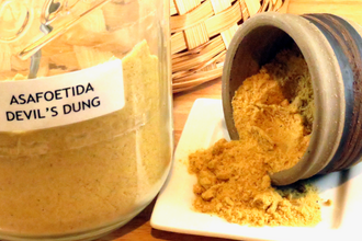 Note that asafoetida resin is so hard and pungent it is usually cut with something else when presented in a powdered form. Additions frequently include wheat or rice flour and/or ground fenugreek, turmeric, and gum arabic. If you see it in its bright yellow form, then it has been cut with turmeric, among other things. If you see it in its peach/tan form, then it is most likely only cut with wheat or rice flour and and an anti-caking agent like gum arabic.